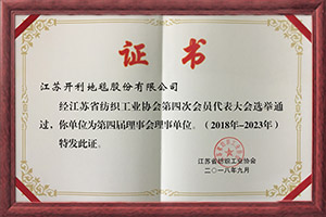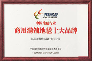 公司嚴(yán)格按照國(guó)際環(huán)保及等級(jí)要求,將“綠色、環(huán)?!崩砟钬灤┑秸麄€(gè)產(chǎn)品制造的全過(guò)程,生產(chǎn)流程堅(jiān)持按照ISO9001:2015質(zhì)量管理體系、ISO14001:2015環(huán)境管理體系進(jìn)行管理營(yíng)運(yùn)。公司擁有中國(guó)環(huán)保地毯認(rèn)證書(shū)、國(guó)際環(huán)保地毯認(rèn)證書(shū)和美國(guó)CRI+PLUS室內(nèi)空氣質(zhì)量認(rèn)證書(shū);2012年開(kāi)利地毯被國(guó)家文化部、商務(wù)部等六部委授予“國(guó)家文化產(chǎn)業(yè)出口重點(diǎn)企業(yè)”稱號(hào); 2014年11月開(kāi)利地毯通過(guò)了全球權(quán)威的認(rèn)證機(jī)構(gòu)挪威船級(jí)社(DNV?GL)認(rèn)證并獲得證書(shū);2016年3月開(kāi)利地毯獲得由歐洲權(quán)威認(rèn)證機(jī)構(gòu) Dedal 頒發(fā)的歐盟CE證書(shū);2016年12月參與發(fā)起成立中國(guó)紡織國(guó)際產(chǎn)能合作企業(yè)聯(lián)盟。
