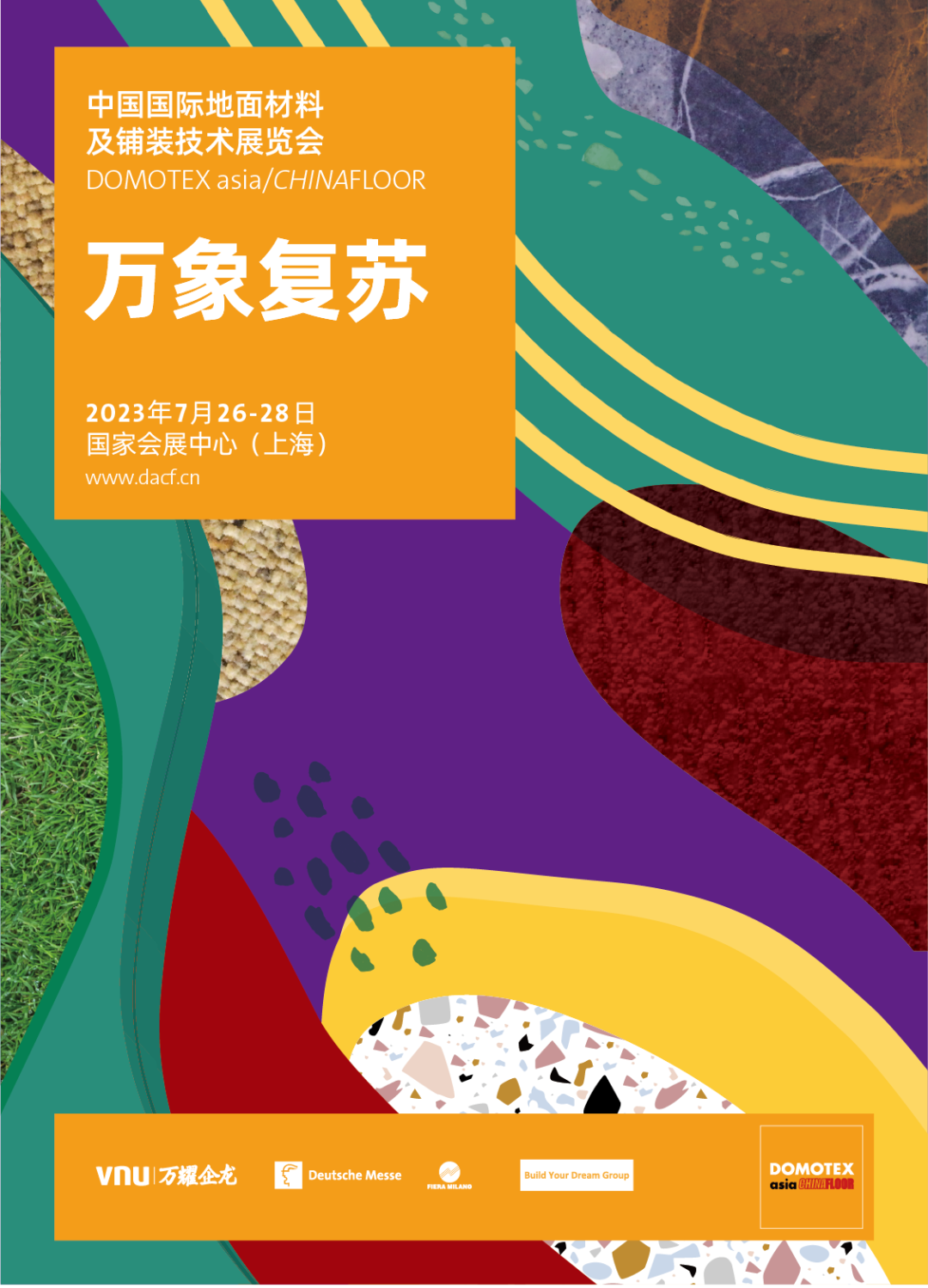 DOMOTEX asia/CHINAFLOOR全新視覺形象“萬象復(fù)蘇”,是由全球地毯行業(yè)極具影響力的媒體《HALI》雜志創(chuàng)作設(shè)計。充滿生機的絢爛色彩,象征著行業(yè)復(fù)蘇,欣欣向榮的美好前景;配以各類材質(zhì)紋理相互融合拼接,契合了當下行業(yè)互融互通的發(fā)展趨勢。